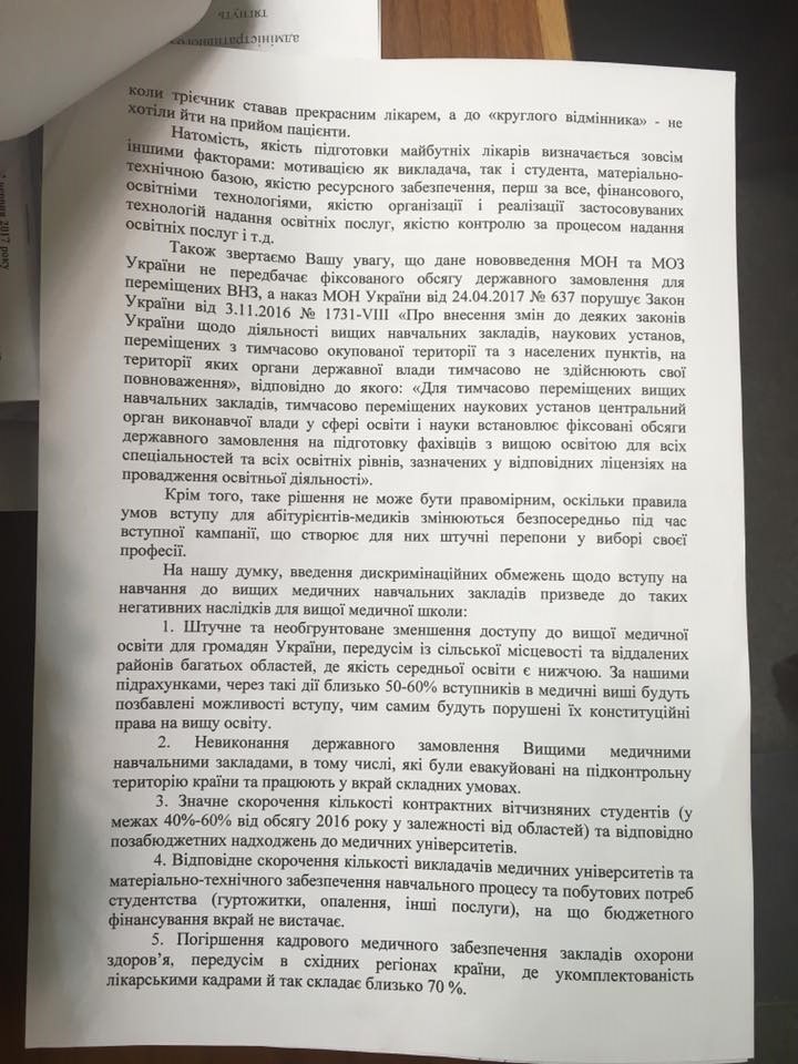 "Згідно з висновком Мін'юсту, запровадження прохідного балу на рівні, не нижче, ніж 150 з кожного сертифікату ЗНО для вступу на медичні спеціальності, відповідає чинному законодавству. Тому, якщо говорити про незаконність запровадження прохідного балу для вступу на медичні спеціальності у 150, то і інші зміни потрібно вважати незаконними, і вимагати їх скасування", - резюмувала Супрун.
