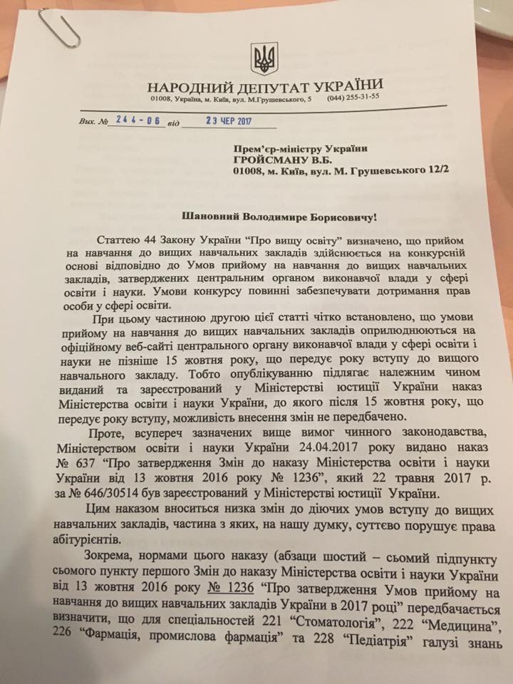 Вона також нагадала, що крім прохідного бар'єру наказом МОН України №637 від 24.04.2017 запроваджуються важливі зміни, які стосуються квот, мінімальних, максимальних обсягів державного замовлення, зарахування абітурієнтів з тимчасово окупованих та непідконтрольних територій та абітурієнтів, які через стан здоров'я не складали ЗНО під час основної та додаткової сесій. Крім того, згідно діючому законодавству, зміни до наказів обов'язково реєструються у Міністерстві юстиції України, де проводиться їх правова експертиза.
