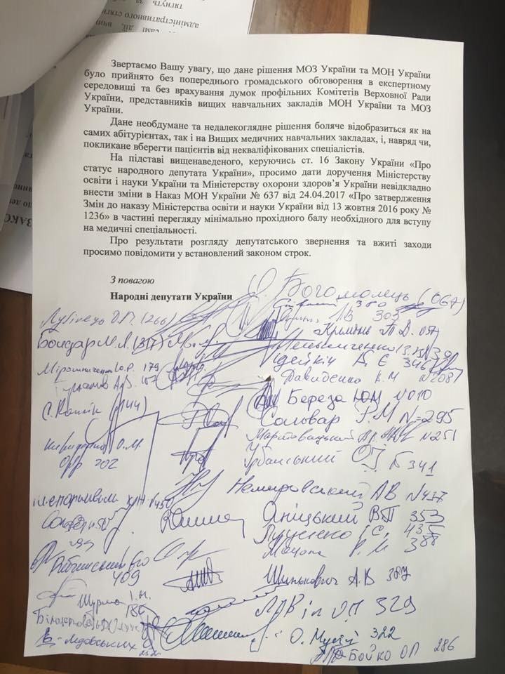 "А всім, хто стурбований якістю підготовки наших лікарів, хочу сказати, що якість майбутнього лікаря визначає те, як він здав державні іспити після завершення навчання в медичному виші, а не вступні бали ЗНО! Хто не зможе вчитися - буде відрахований після першої чи другої сесії", - підкреслила власну позицію народний депутат.