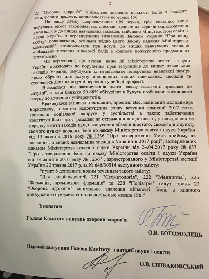 Міністерство освіти і науки України скасувало наказ №637, яким, за поданням Міністерства охорони здоров'я, встановлювалось, зокрема, введення мінімального прохідного бар'єру для абітурієнтів медичних спеціальностей - 150 балів з кожного конкурсного предмета ЗНО, повідомила очільниця Комітету Верховної Ради з охорони здоров'я Ольга Богомолець.