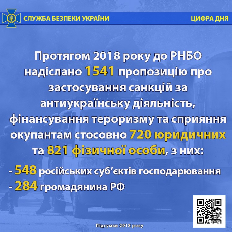 "Протягом 2018 року до РНБО надіслано 1541 пропозицію про застосування санкцій за антиукраїнську діяльність, фінансування тероризму та сприяння окупантам стосовно 720 юридичних та 821 фізичної особи", - йдеться у повідомленні.