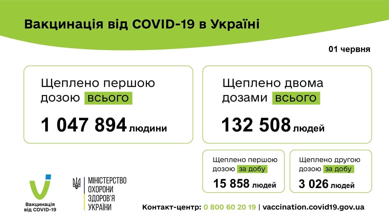 Упродовж вівторка, 1 червня, в Україні зробили щеплення проти коронавірусу 18 884 людям. При цьому одну дозу отримали 15 858 людей, повністю імунізовані - 3 026 людей. Про це йдеться в Telegram-каналі Міністерства охорони здоров'я України.