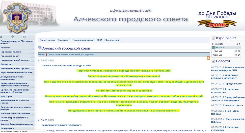 8 травня на офіційному сайті міської ради Алчевська з'явилася заява про вихід з складу так званої "Луганської народної республіки".