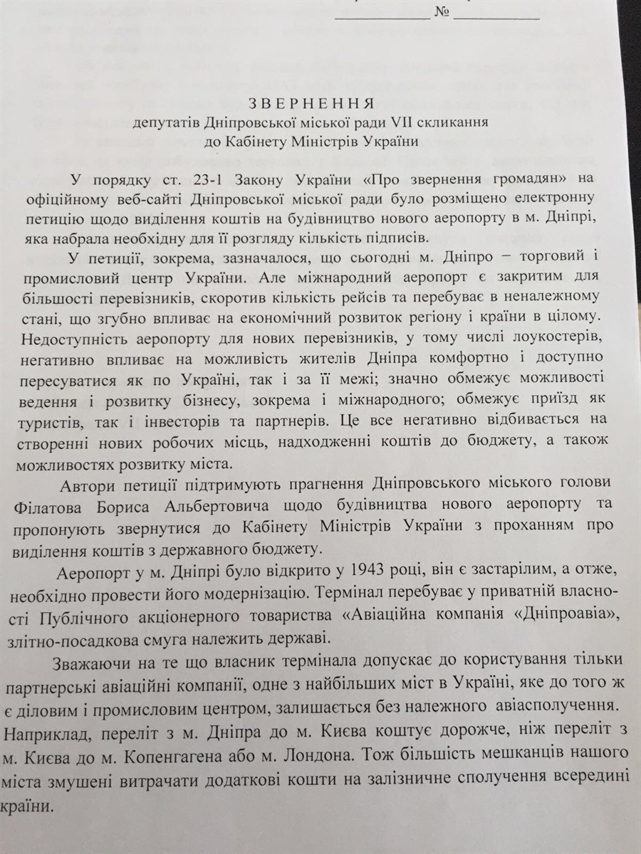 Раніше мер Дніпра Борис Філатов звернувся з відкритим листом до президента Петра Порошенка, в якому висловив занепокоєння відсутністю ефективного аеропорту на території Дніпропетровської області. Він просив президента вплинути на ситуацію, за його словами, бюджет Дніпра не в змозі самостійно реалізувати такий масштабний проект.