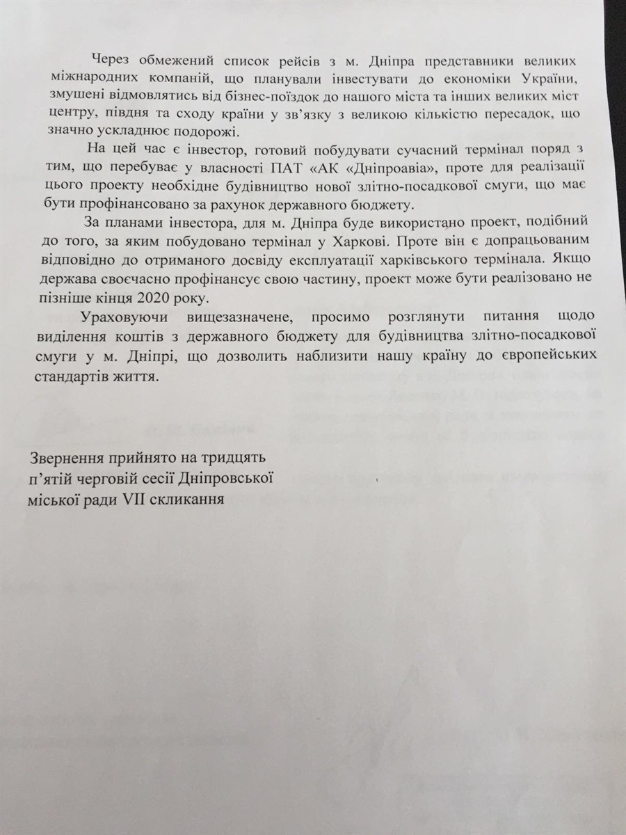 У петиції йшлося про те, що нині Дніпро залишається єдиним містом-мільйонником не лише в Україні, а й у світі, яке не має власного ефективного аеропорту. Зазначалось, що відкрите 75 років тому летовище потребує якнайшвидшої модернізації.