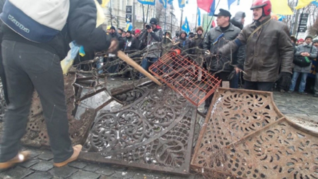 Митингующие баррикадируют улицу Грушевского на подступах к зданию Кабинета министров Украины.