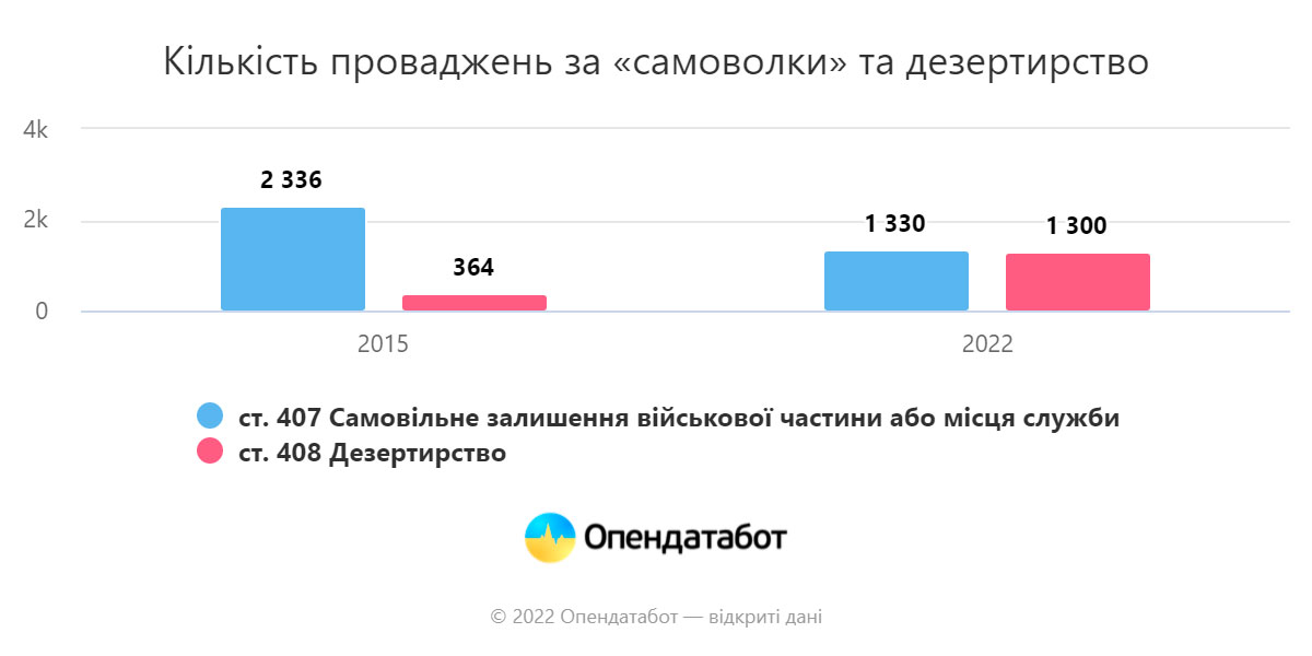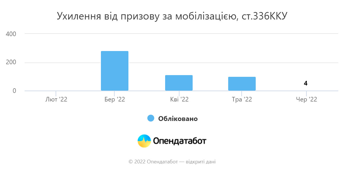 Відповідно до даних «Опендатабот», протягом перших місяців війни в Україні в середньому щомісяця відкривалося 198 нових кримінальних справ за ухилення від мобілізації. При цьому за перші шість місяців 2022 року правоохоронці зареєстрували 500 таких справ, що майже вчетверо менше, ніж за відповідний період 2015 року (1908 справ).