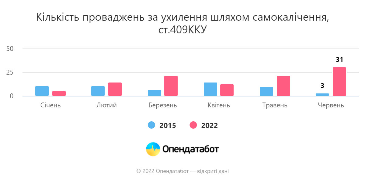 «Також за перше півріччя 2022 року вдвічі збільшилась кількість проваджень за статтею 409 (Ухилення від військової служби шляхом самокаліцтва або іншим способом) у порівнянні з відповідним періодом 2015 року (109 проти 57)», – роз’яснили фахівці.