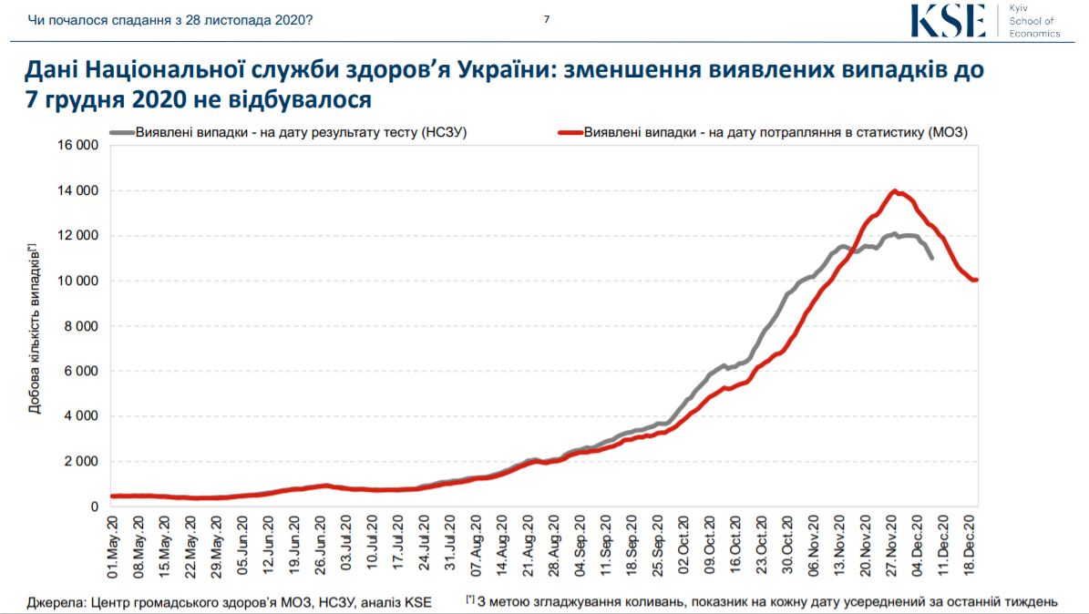 Згідно рекомендацій КШЕ, зменшення виявлених випадків може бути пов’язане із зменшенням обсягів тестування та періодом затримки у потраплянні даних до статистики. Ретроспективне віднесення даних до реальних дат захворювання не підтверджує спаду у виявлених випадках, принаймні до 3 грудня. Коефіцієнт виявлення і далі надмірно високий. Частка позитивних випадків стабільно у 6 разів вища за рекомендовану ВООЗ для контролю захворюваності (33% проти 5%). Не відбувається сталого зменшення госпіталізацій та смертей.