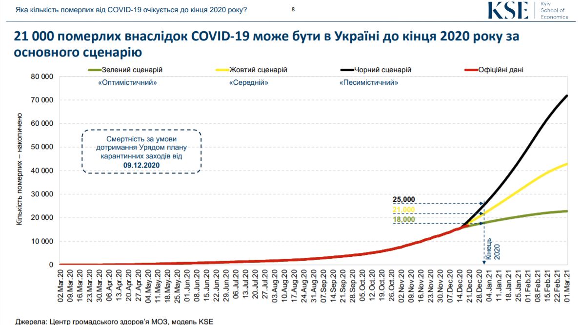 Нещодавнє моделювання ситуації Київської школи економіки (KSE) демонструє, що унаслідок COVID-19 до кінця року можуть померти 21 000 людей.