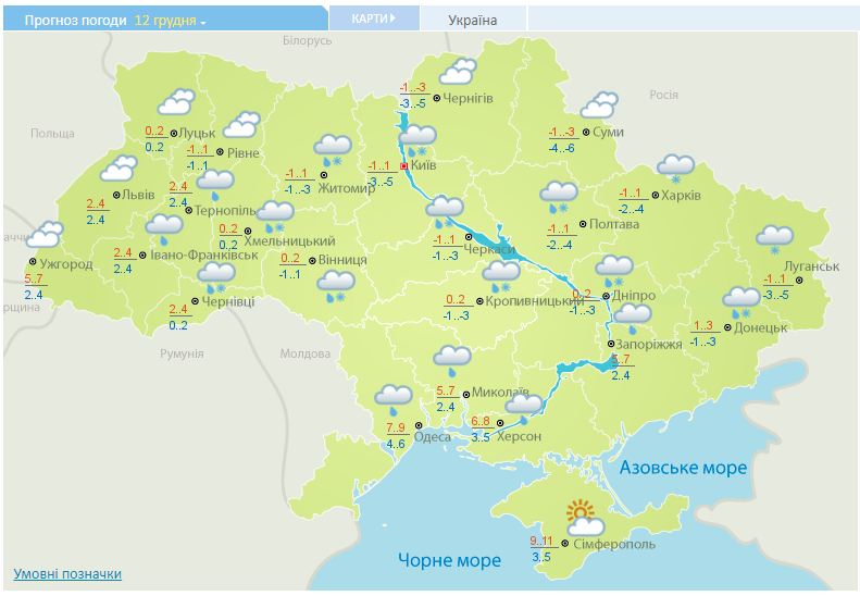 У суботу, 12 грудня, очікується мокрий сніг з дощем. Такі опади прогнозуються практично по всій країні, крім Рівненської, Волинської, Закарпатської, Львівської, Чернігівської та Сумської областей. До того ж, до дощу, на Сході і в Центрі України також може приєднатися мокрий сніг.