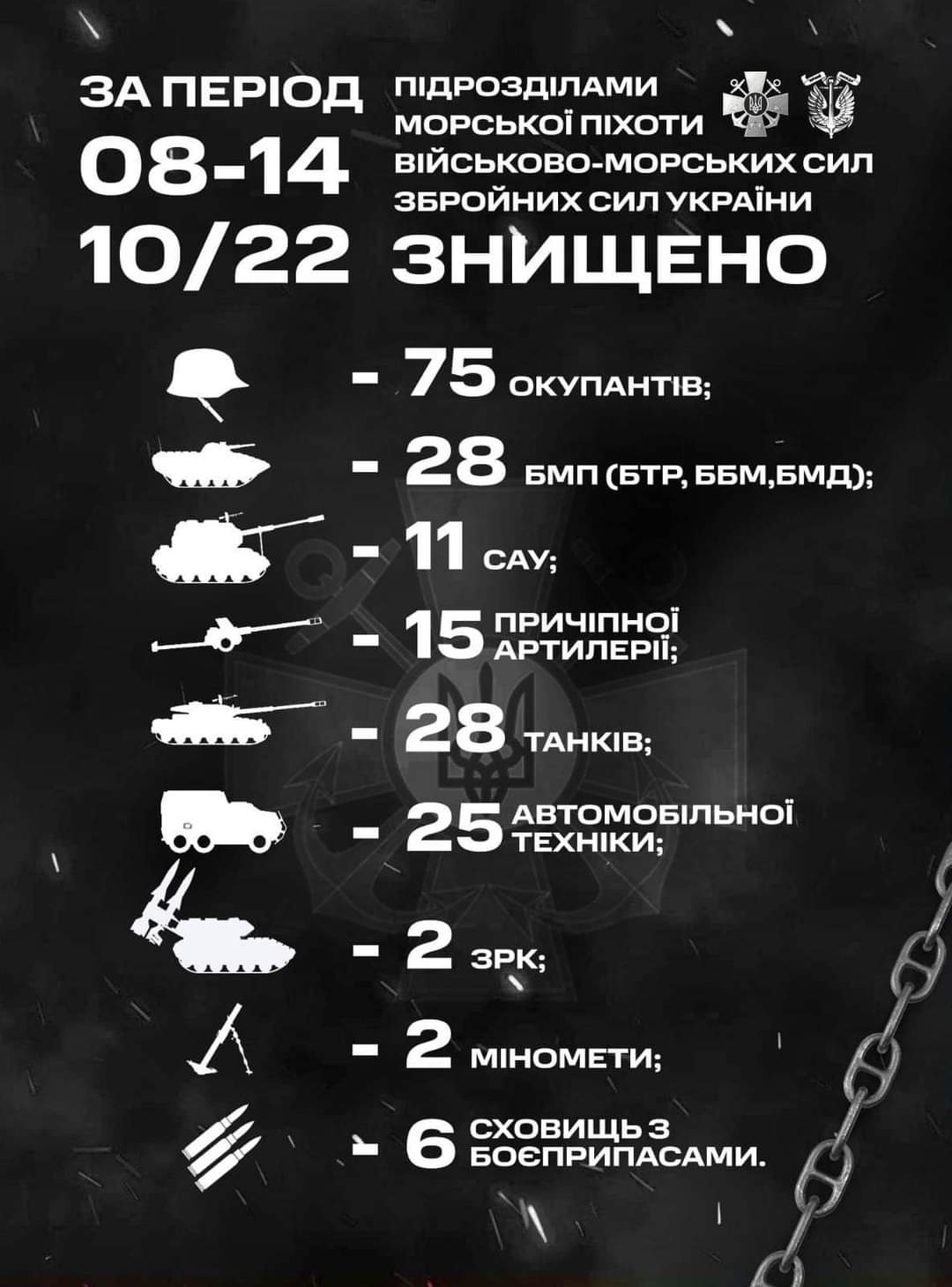 "За уточненими даними в період з 08.10.2022 по 14.10.2022 наші воїни знищили: особового складу – понад 75 окупантів, танків – 28, БТР (БМД, БМП, ББМ) - 28, САУ – 11, причіпної артилерії – 15, РСЗВ – 6, мінометів – 2, автомобільної техніки – 25, ЗРК – 2, а також сховищ з боєприпасами – 6", - йдеться в повідомленні.