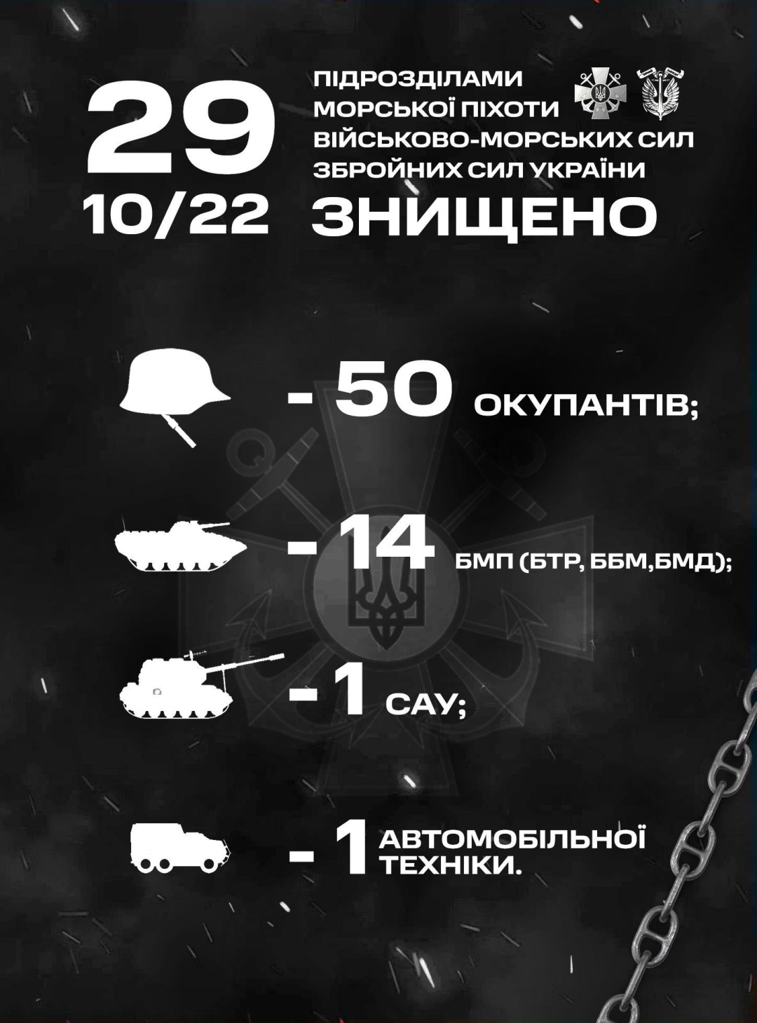 "29 жовтня, військові частини та підрозділи Командування морської піхоти Військово-Морських Сил Збройних сил України, які входять до складу угруповань продовжували виконувати завдання щодо відсічі повномасштабної збройної агресії Російської Федерації. У ході боїв морські піхотинці знищили 10 БМП, один БТР, одну ББМ та понад 50 окупантів", - йдеться в повідомленні.