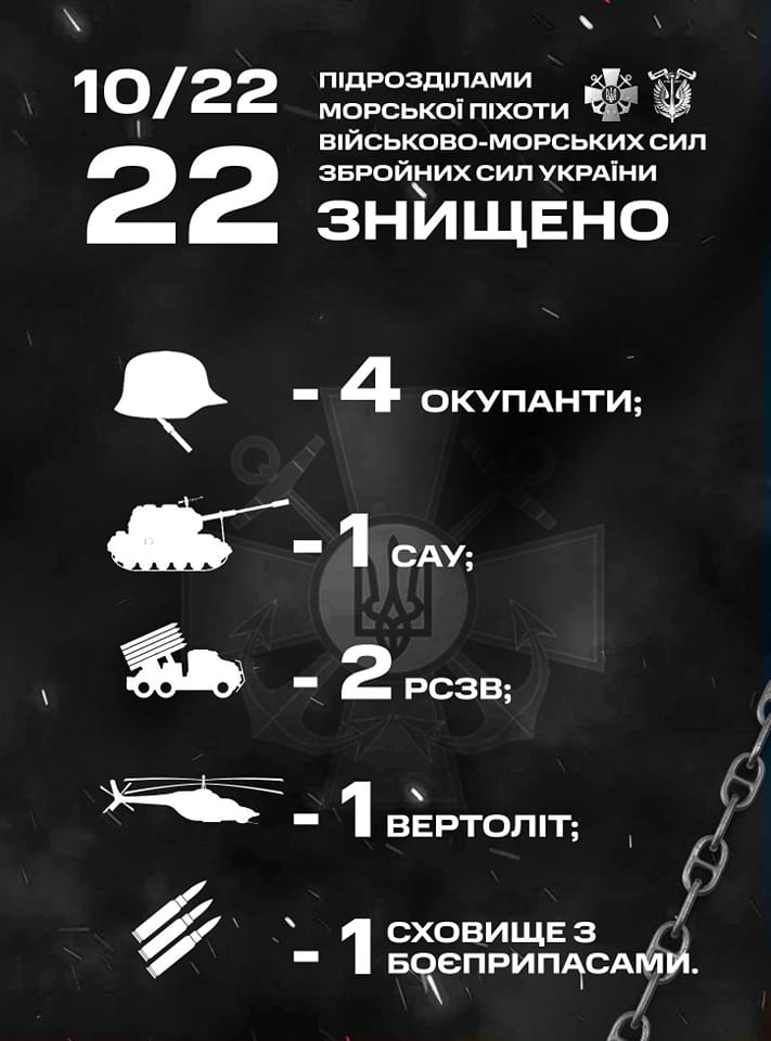 "Артилерійські військові частини та підрозділи Командування морської піхоти ВМС ЗС України наносили вогневе ураження по загарбниках, в результаті чого наші воїни знищили самохідну гаубицю «Мста-С», дві реактивні системи залпового вогню «Град» та склад із боєприпасами. Остаточні втрати ворога уточнюються", - йдеться в повідомленні.