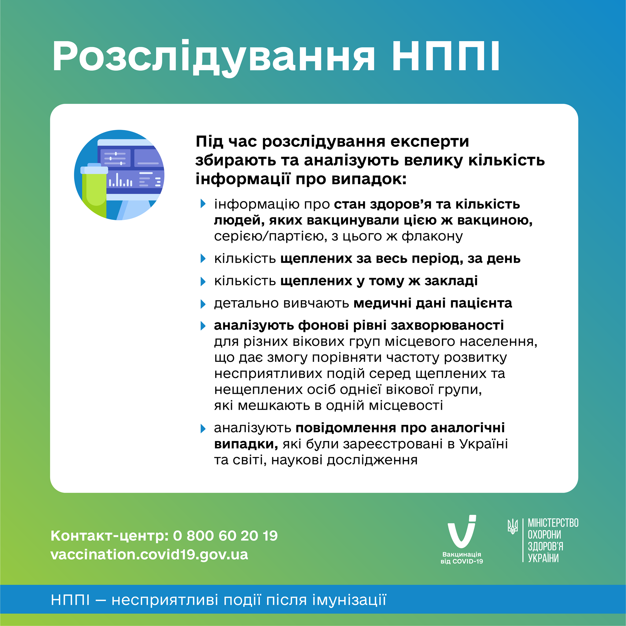 Повідомляється, що усі серйозні випадки НППІ ретельно розслідуються, щоб визначити, чи дійсно вони пов’язані з вакцинацією. Обов'язково потрібно повідомляти про всі випадки серйозного НППІ, зокрема про важкі стани та летальні випадки, які сталися протягом 30 днів після вакцинації (незалежно від того, чи це перша, чи друга доза вакцини).