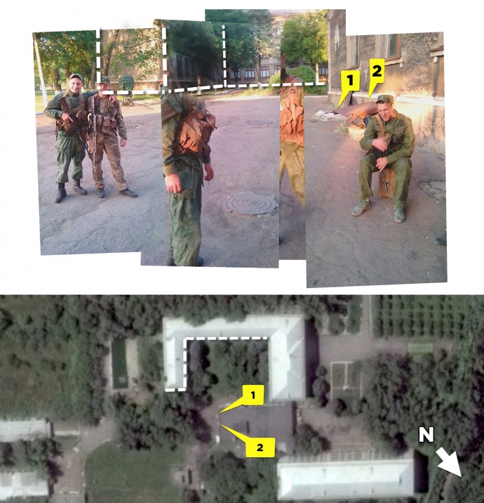Об'єднавши зображення будівель та інших орієнтирів на задньому плані фотографій, дослідники визначили, що на них зображено П-образна будівля, що використовується 11-тим взводом полком бойовиків "Схід", яке знаходиться в Макіївці.