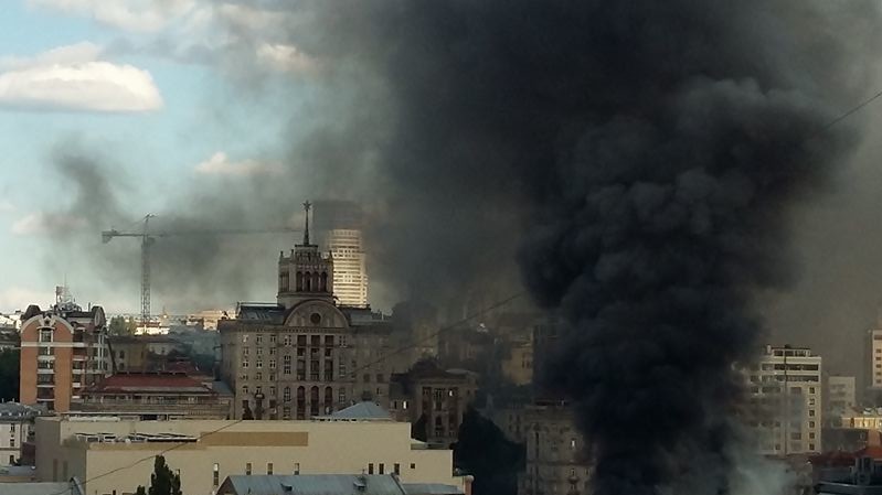 У Києві горить будинок за адресою Хрещатик, 40/1, навпроти Центрального універмагу, в якому раніше був розташований Центральний гастроном, з 2006 року закритий на ремонт. На першому поверсі цього будинку находятся аптека, салон мобільного зв'язку і кілька магазинів. Верхні поверхи затягнуті риштуванням і знаходяться на ремонті. На місце надзвичайної події щойно прибули кілька машин швидкої допомоги та пожежні розрахунки.