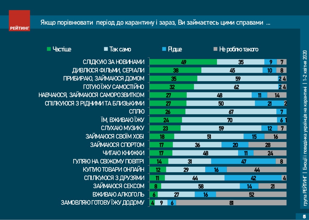 Частіше дивитися фільми та серіали почали 38% громадян, частіше прибирають вдома тепер 35% респондентів, а готують їжу – 32%. На заняття саморозвитком більше часу виділили 27% громадян, стільки ж більше почали спілкуватися з рідними. Ще 26% українців почали більше спати. Більше їсти почали 24% респондентів, а слухати музику – 23%. Згідно з опитуванням, кожен п'ятий став частіше займаються своїм хобі, читати книги або ж займаються спортом.