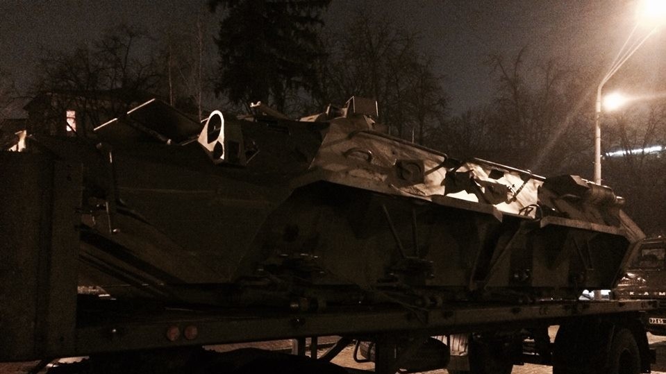 Російські танки, "Гради", БМП, БТР та іншу військову техніку, яку бійці АТО взяли в "полон", звозили на площу всю ніч.