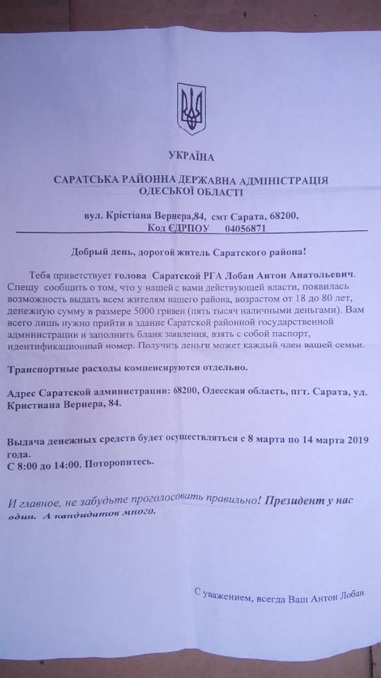 Про правопорушення поліцію поінформував голова Саратської районної державної адміністрації. За словами заявника, на території району розповсюджують листівки з інформацією від його імені про видачу в адміністрації 5 тисяч гривень кожному місцевому жителю від 18 до 80 років, який на виборах віддасть свій голос за певного кандидата.