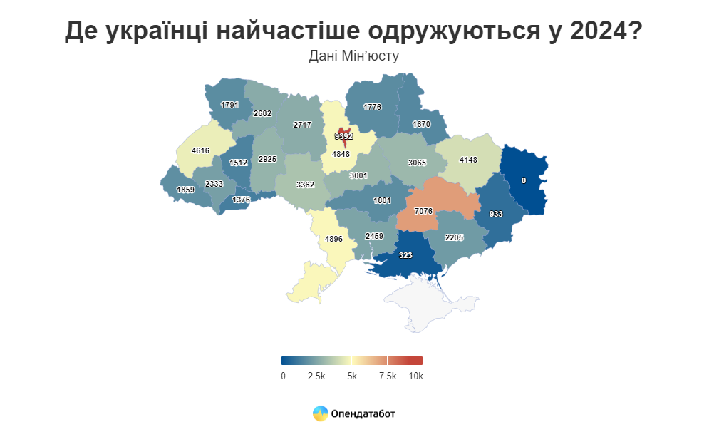 Лідером за кількістю шлюбів є Київ, де створили 9 392 нових сімей. Друге місце посідає Дніпропетровщина — 7 076 одружень, а замикає трійку лідерів Одещина — 4 896 новостворених сімей.