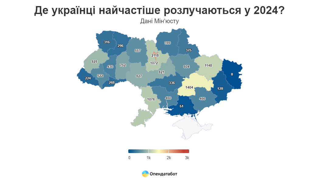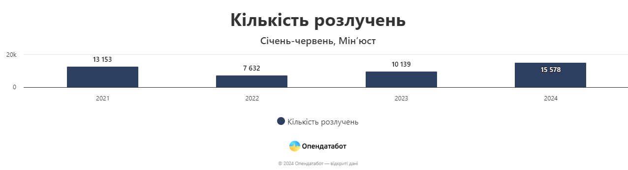 Тим не менше в Україні стабільно більшає розлучень. Так, за перші шість місяців 2024 року було зафіксовано 15 578 розірвань шлюбу, що в 1,5 рази більше за відповідний період минулого року та на 18% більше, ніж за перше півріччя 2021 року.