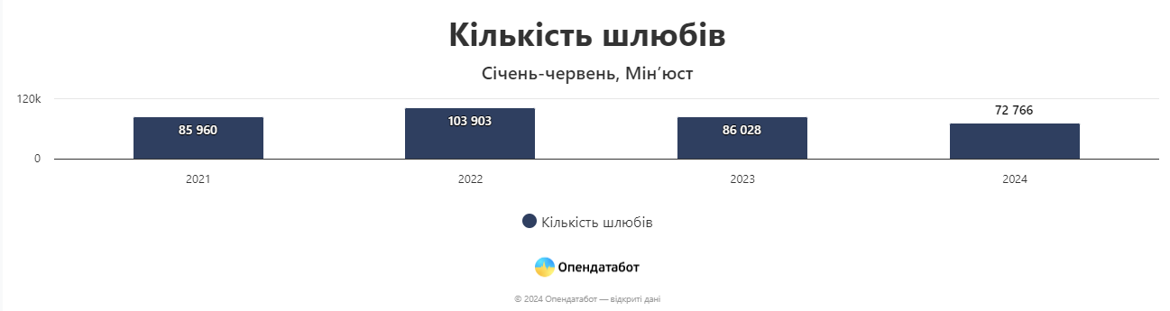 Так, за перші півроку 2024-го за даними Мін'юсту, уклали понад 72 тисячі шлюбів. Це на 15% менше, ніж минулоріч та на третину менше, ніж зазвичай до 2022 року. Більше того, цього року вперше з початку повномасштабної війни було створено навіть менше нових родин, аніж до 2022 року. Натомість шлюбних договорів побільшало на чверть.