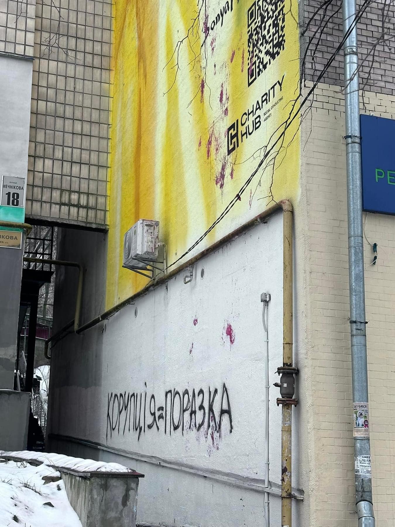 Крім того, на вулиці Мечникова, червоною фарбою кілька днів тому облили ще один мурал, авторства екснареченої Гринкевича, повідомила у Facebook засновниця ГО «Місто-сад» Женя Кулеба. Під самим малюнком написали «Корупція = поразка».