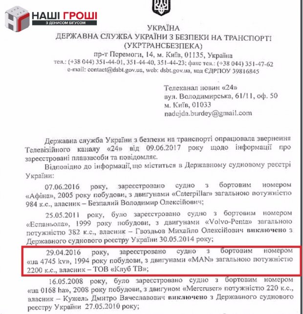 Журналістам телепередачі вдалося знайти цю яхту завдовжки 23 метри, зареєстровану на компанію "Клуб ТБ", на закритій парковці яхт-клубу "Рів'єра". Єдиним власником клубу є Олег Малюта.