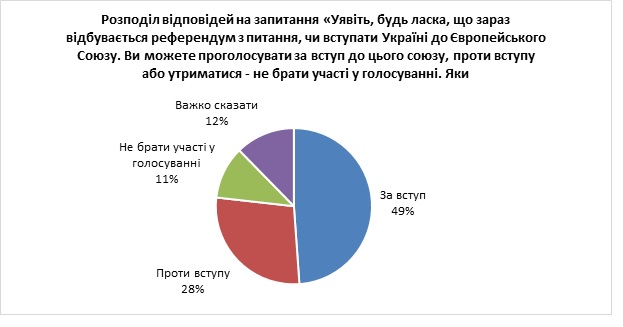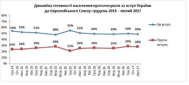 Якби референдум з питання вступу Україні до Європейського Союзу проводився у лютому 2017 року, 49% жителів України проголосували б за вступ України до ЄС, 28% - проти, і решта 23% - не визначилися, або не брали би участі у голосуванні, свідчать дані опитування КМІС.