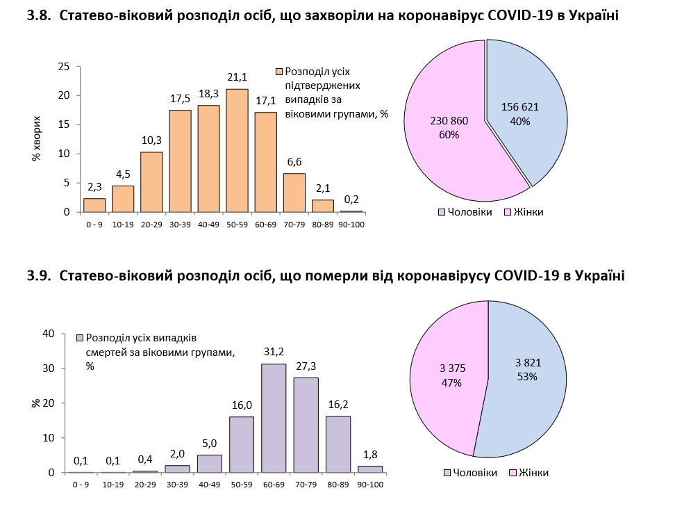 Також згідно статистики захворювань коронавірусом в Україні, яку надає РНБО, більшість з тих, хто хворіють складають жінки - 60% але серед тих, хто померли від коронавірусу більшість чоловіків - 53%.