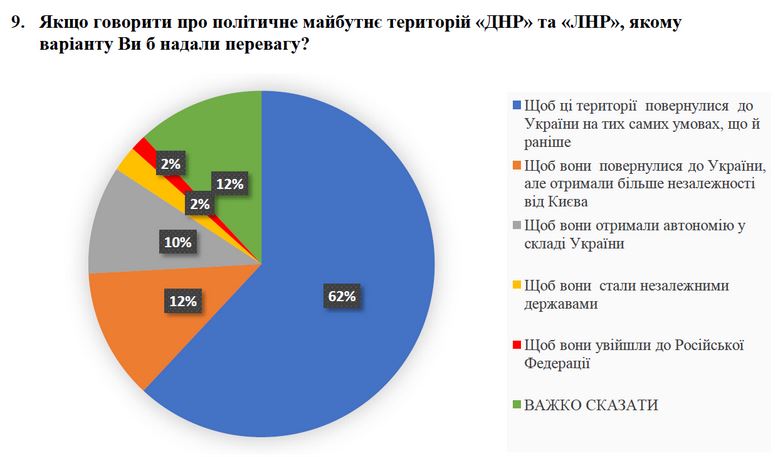 У свою чергу від'єднання цих територій від України підтримують лише 4%. Ще близько 22% вважають, що ці території мають отримати більше самостійності від центральної влади, але в межах України.