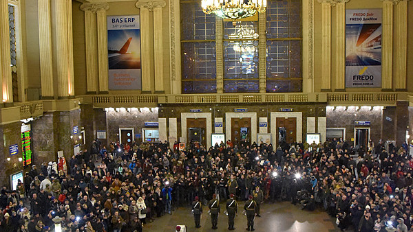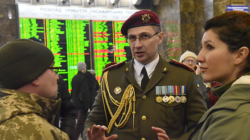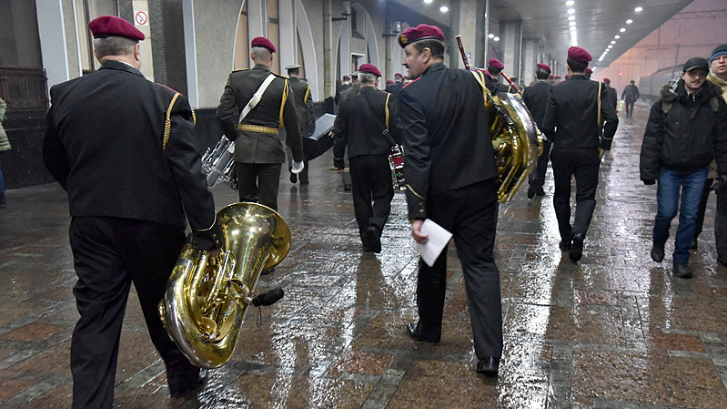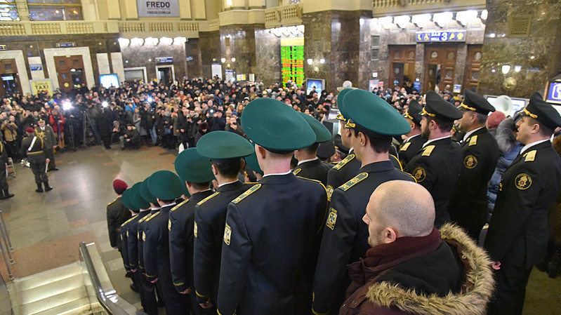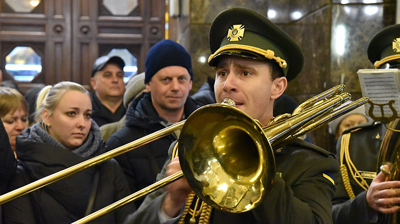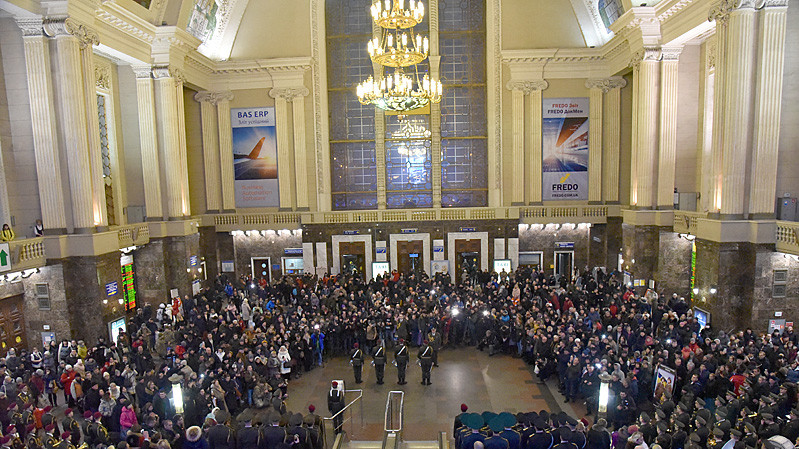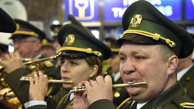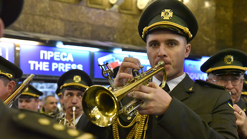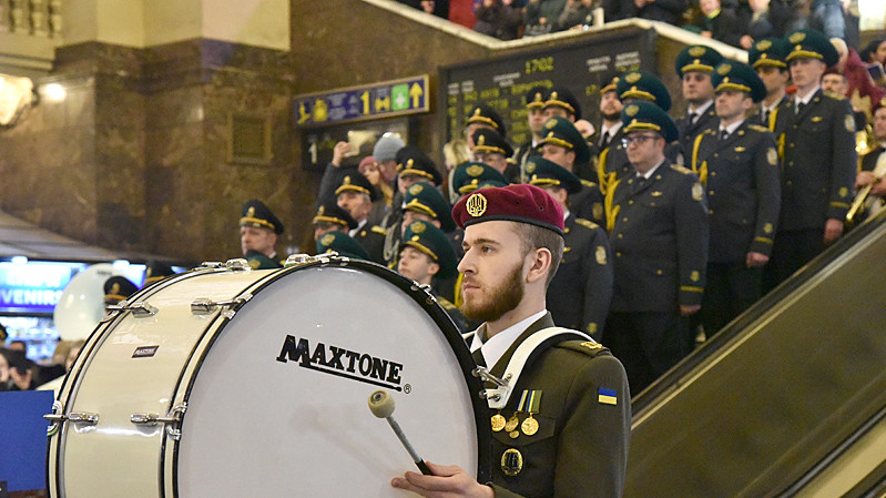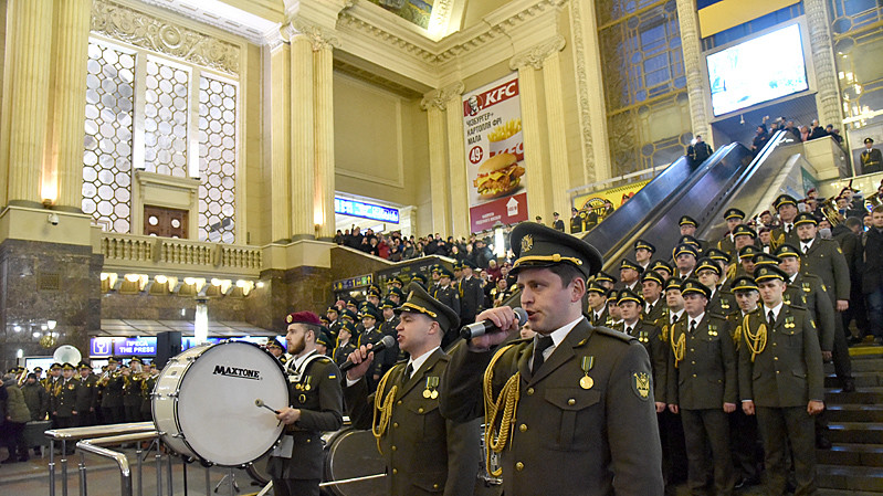 До Дня пам'яті Героїв Крут у вестибюлі Центрального вокзалу "Київ-Пасажирський" відбувся музичний флешмоб за участю військових музичних колективів.