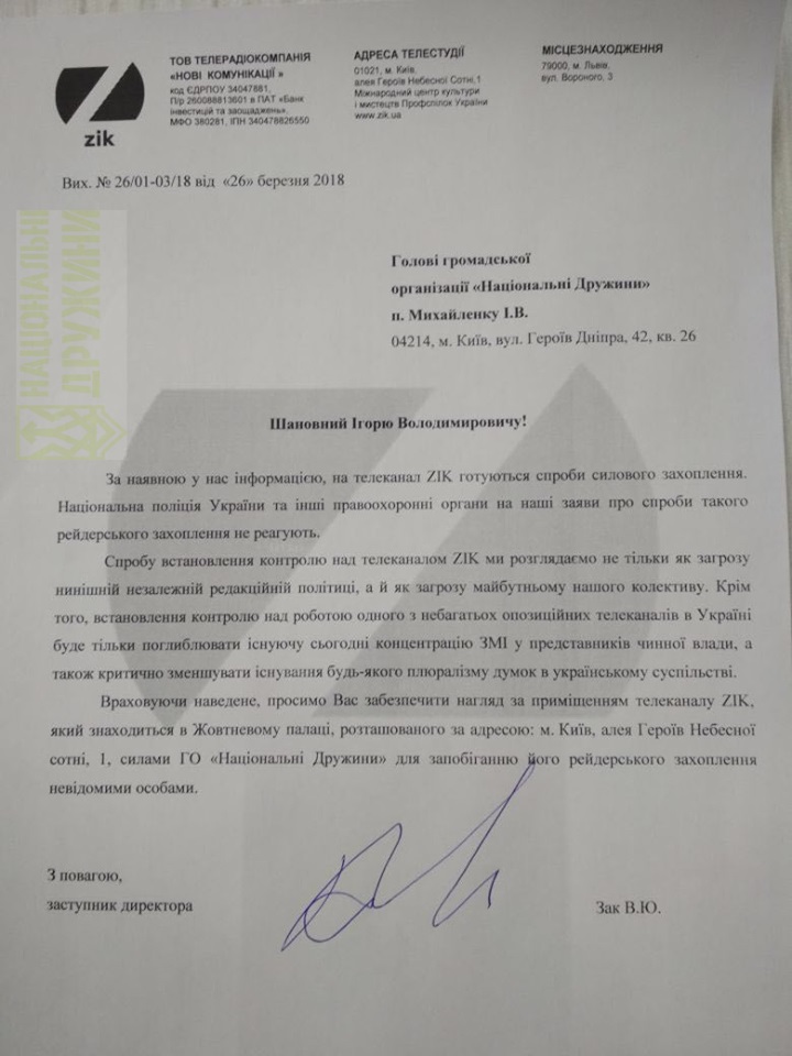 У ньому також є прохання "забезпечити нагляд за приміщенням телеканалу силами ГО "Національні дружини".
