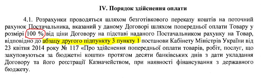 Замовлення Нацполіції передбачає передоплату протягом десяти банківських днів з дати підписання договору. При цьому містить посилання на абзац 2 підпункту 3 пункту 1 постанову Кабінету міністрів від 23 квітня 2014 року №117. Згідно з цим абзацом, передоплата на строк не більше трьох місяців допускається при закупівлі товарів для науково-дослідних та дослідно-конструкторських робіт.