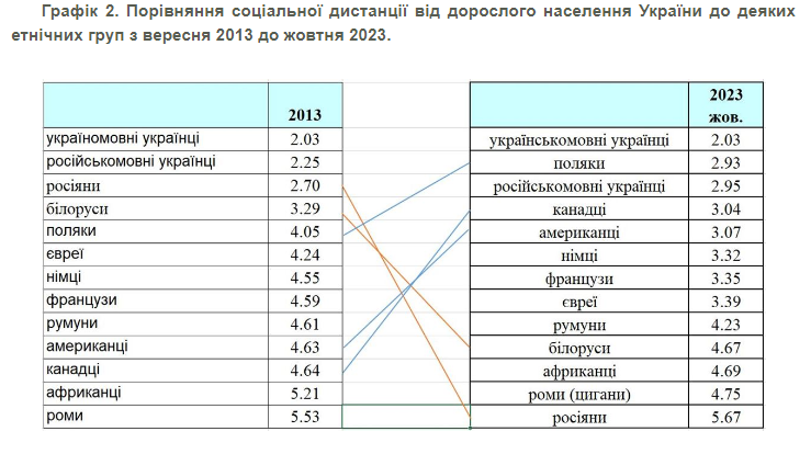 Соціологи зазначають, що порівняно з минулим роком суттєво (зменшилася соціальна дистанція, тобто покращилося ставлення до канадців, американців, німців і французів, тобто до представників головних союзників України в боротьбі з Росією.