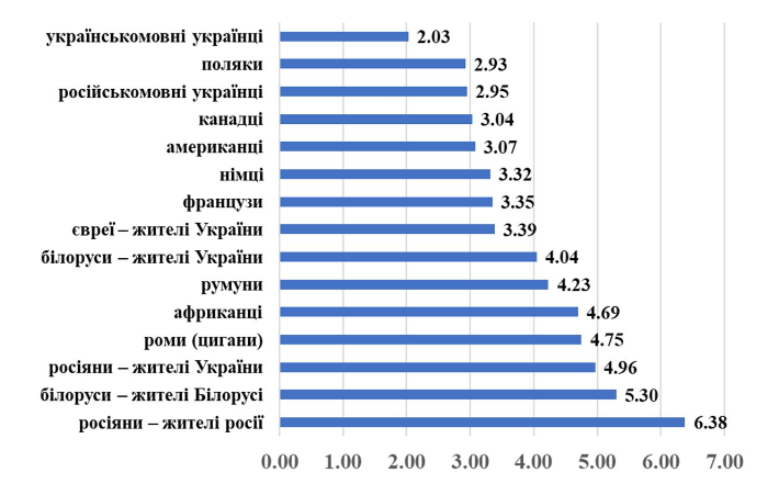Найбільша соціальна дистанція до африканців (4,69), ромів (4,75), росіян-жителів України (4.96), білорусів – жителів Білорусі (5.30). Останнє місце з найбільшою соціальною дистанцією займають росіяни-жителі Росії (6.38). Більшість українців, а саме 80%, не допускали б в Україну росіян навіть як туристів.