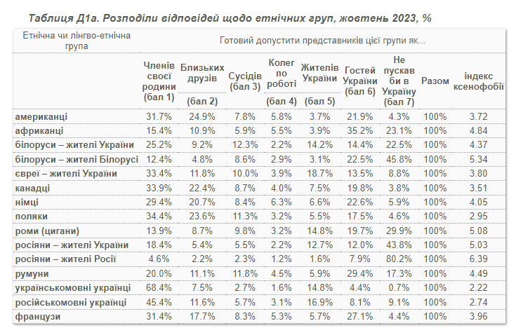 Так, найменша соціальна дистанція серед громадян України до україномовних українців (індекс 2,03), далі йдуть поляки і російськомовні українці (індекс практично однаковий - 2,93 і 2.95). Більшість опитаних готові допустити представників цих груп як членів своєї родини і близьких друзів. Потім йдуть канадці і американці, потім німці, французи і євреї-жителі України.
