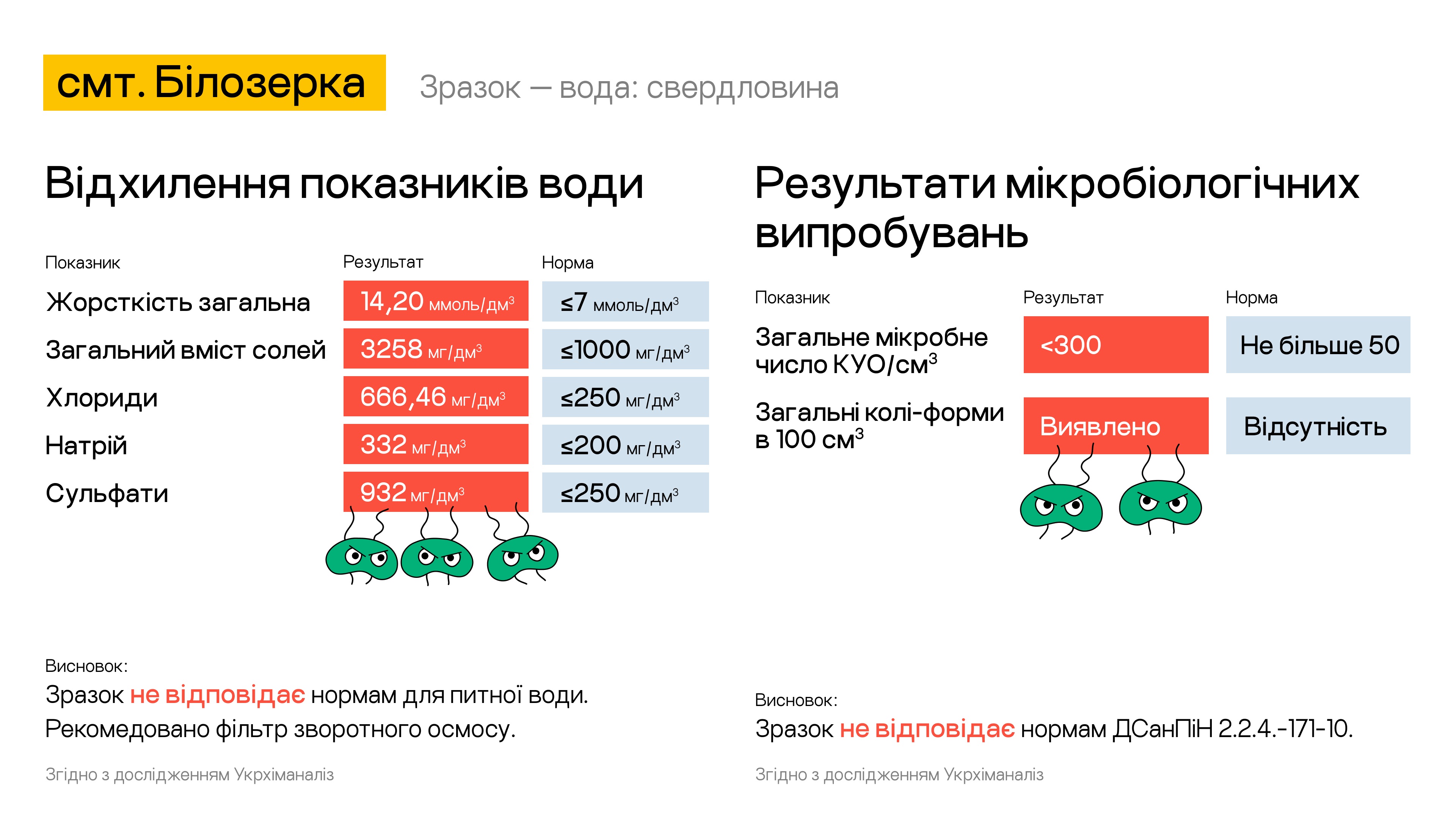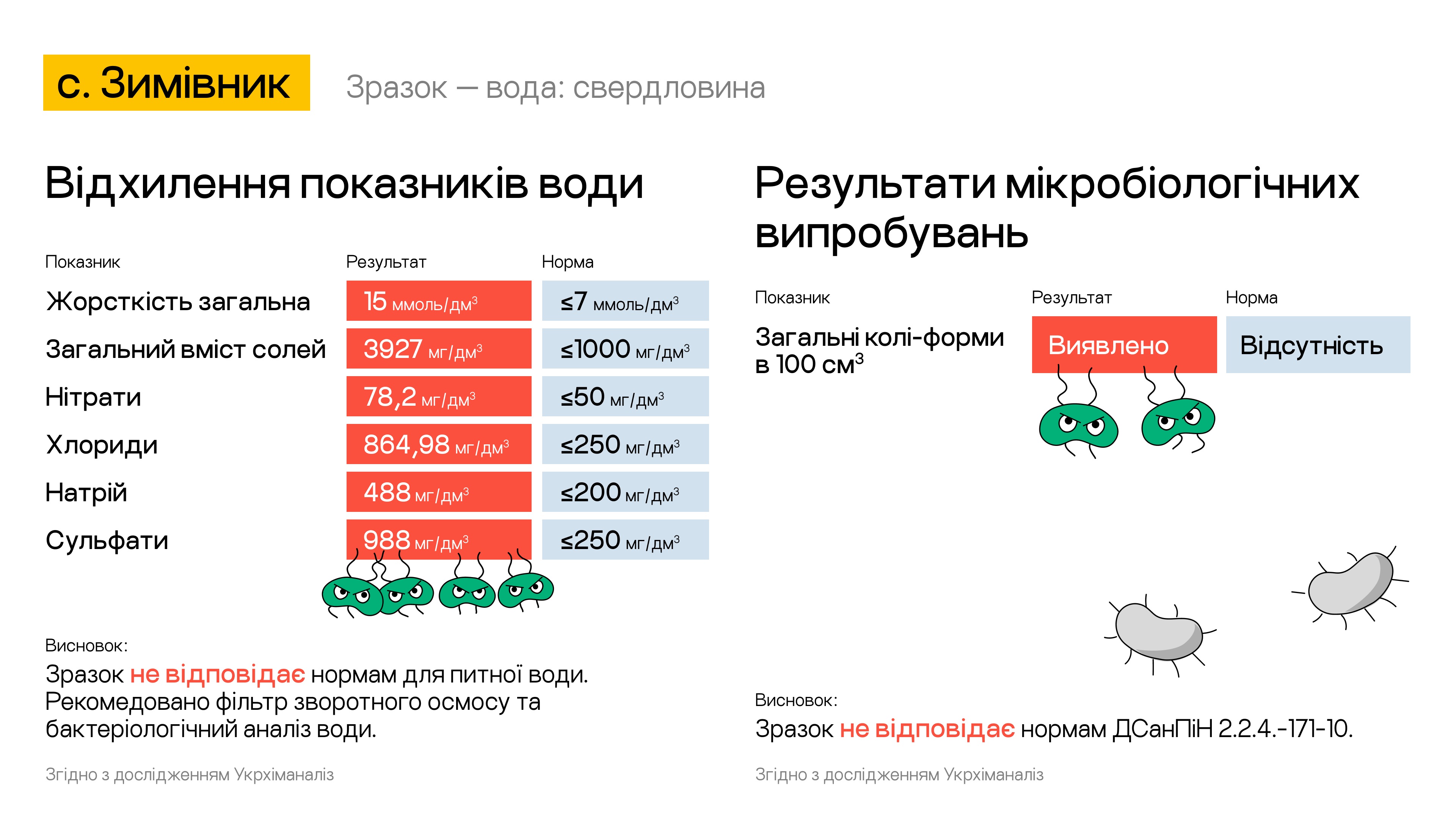 Так, за даними аналізу води із свердловин в деяких населених пунктах області вона досі не відповідає нормам Держсанепідемстанції. Зокрема досі перевищують норму у 3-5 разів такі показники як жорсткість води, загальний вміст солей, нітрати, хлориди, натрій і сульфати. У деяких населених пунктах вода ще й містить небезпечні бактерії.