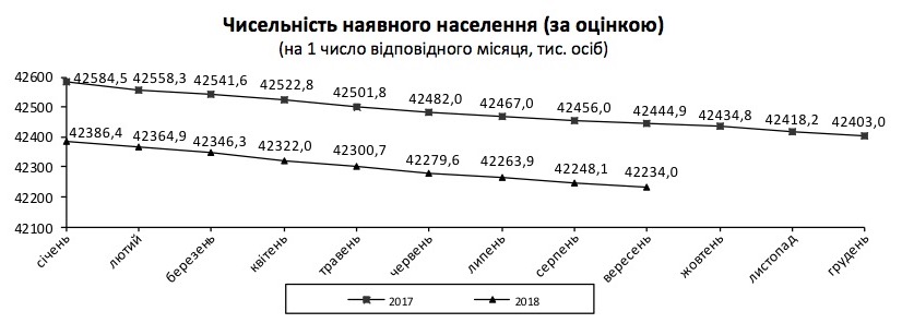 Чисельність наявного населення в Україні за оцінкою на 1 вересня склала 42 мільйони 234 тисячі осіб. Як повідомляє Державна служба статистики України, протягом січня–серпня цього року чисельність населення зменшилася на 152,4 тисячі осіб. Кількість померлих продовжує значно перевищувати кількість народжених.