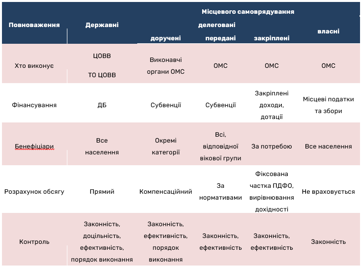Після того, як повноваження розмежували між державою та місцевим самоврядуванням і між рівнями самоврядування, постає питання: як розділити їх уже всередині самоврядування? Критерієм такого розподілу на делеговані та власні є соціальний чи комунальний характер таких повноважень.