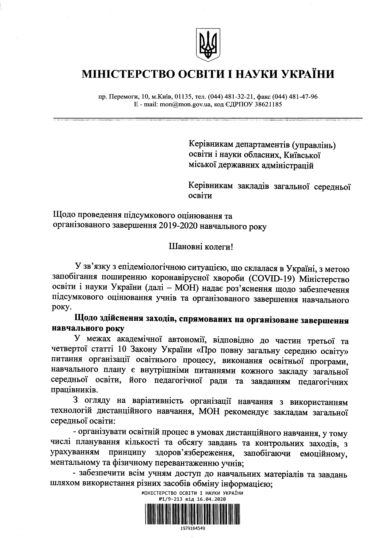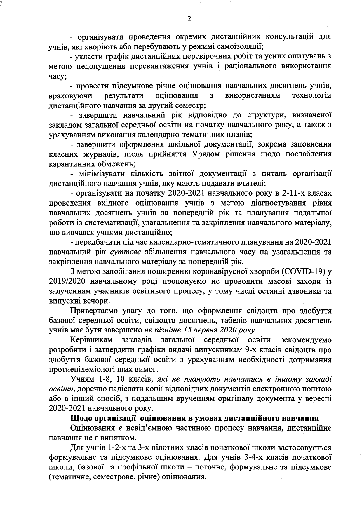 Окрім цього, МОН надало рекомендацію не проводити у цьому навчальному році "масові заходи із залученням учасників освітнього процесу", таких як випускні та шкільні дзвоники. Оформлення табелів та атестатів шкільні заклади мають до 15 червня.