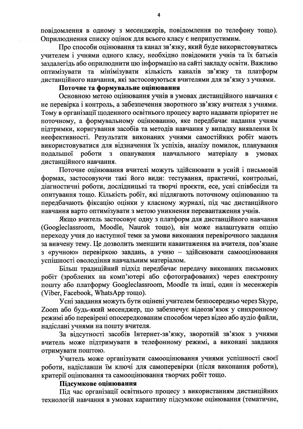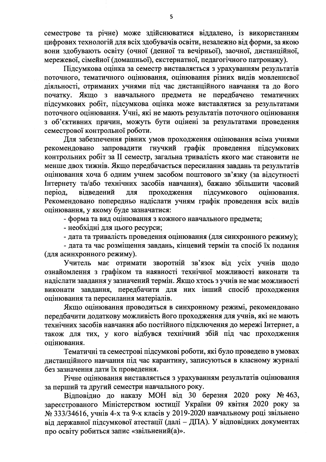 Як зазначає міністерство "основною метою оцінювання учнів в умовах дистанційного навчання є не перевірка знань та оцінювання, а забезпечення зворотного зв'язку вчителя з учнями". Для цього викладачам дозволили надавати креативні завдання та проєкти.