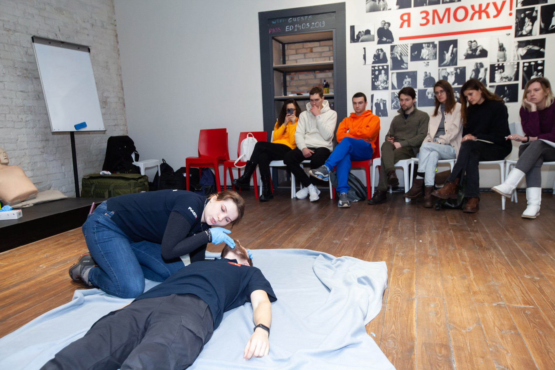 Протягом тренінгу розбираються базові правила й принципи надання допомоги, навчають оцінювати ситуації в контексті власної безпеки, зрозуміти, що робити у разі зупинки дихання та серця, при інсульті та серцевому нападі, навички зупиняти кровотечі, надавати допомогу при травмах шиї і хребта та інших ділянок тіла.