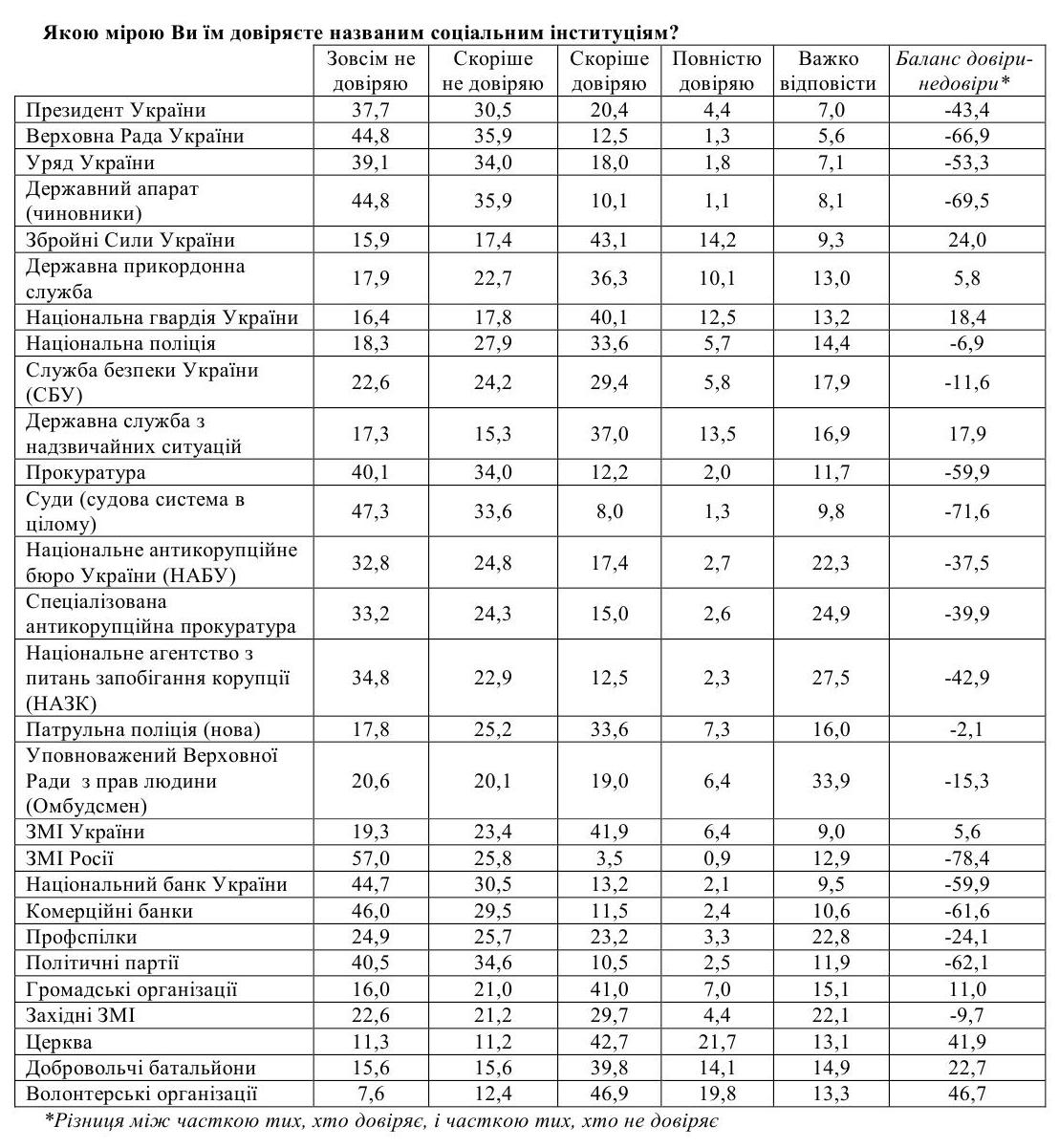 Президенту України довіряють 24,8% опитаних, не довіряють – 68,2%, уряду – відповідно 19,8% і 73,1%, Національному банку – відповідно 15,3% і 75,2%), Верховній Раді – відповідно 13,8% і 80,7%. Довіру до державного апарату (чиновників) висловили 11,2% опитаних, не довіряють – 80,7%.