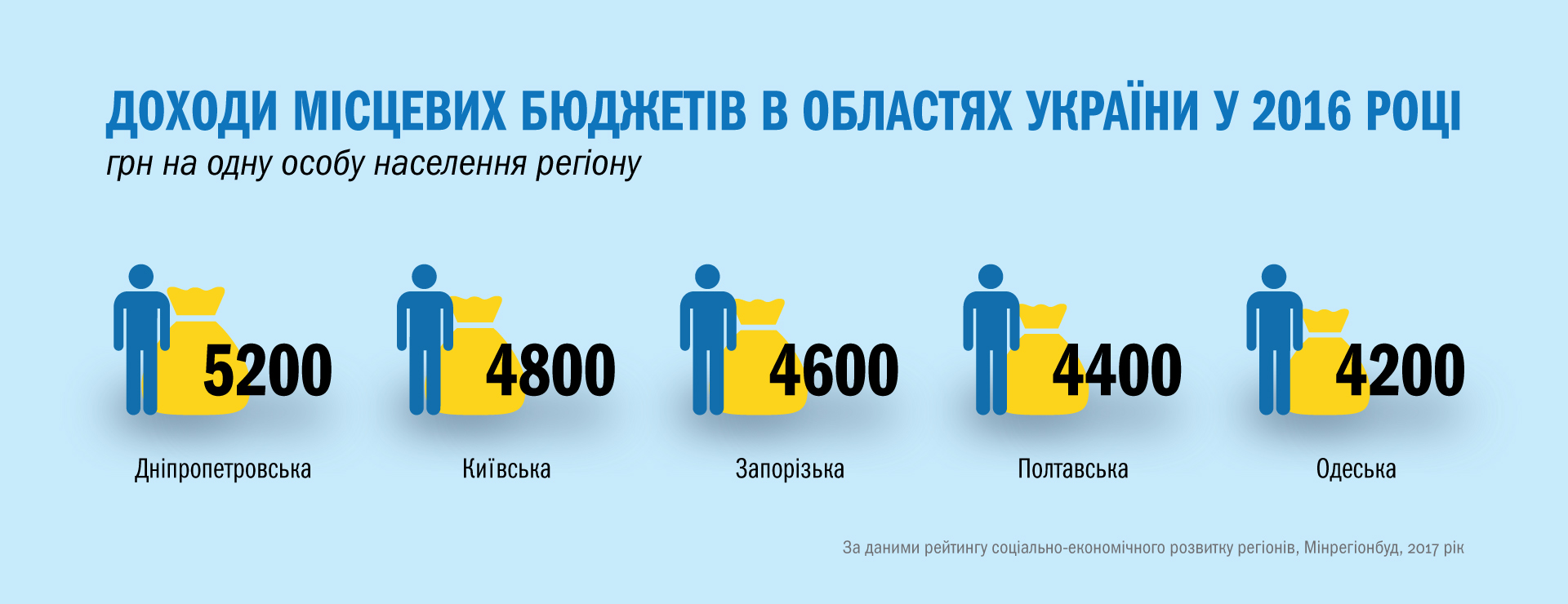 Найбільший обсяг доходів місцевих бюджетів у розрахунку на одну особу населення регіону за 2016 рік, без врахування Києва, зафіксовано у Дніпропетровській (5,2 тис. грн.) та Київській областях (4,8 тис.грн). Такі дані моніторингу соціально-економічного розвитку регіонів, підготованого Мінрегіонбудом у травні 2017 року, повідомляє "Лівий берег".