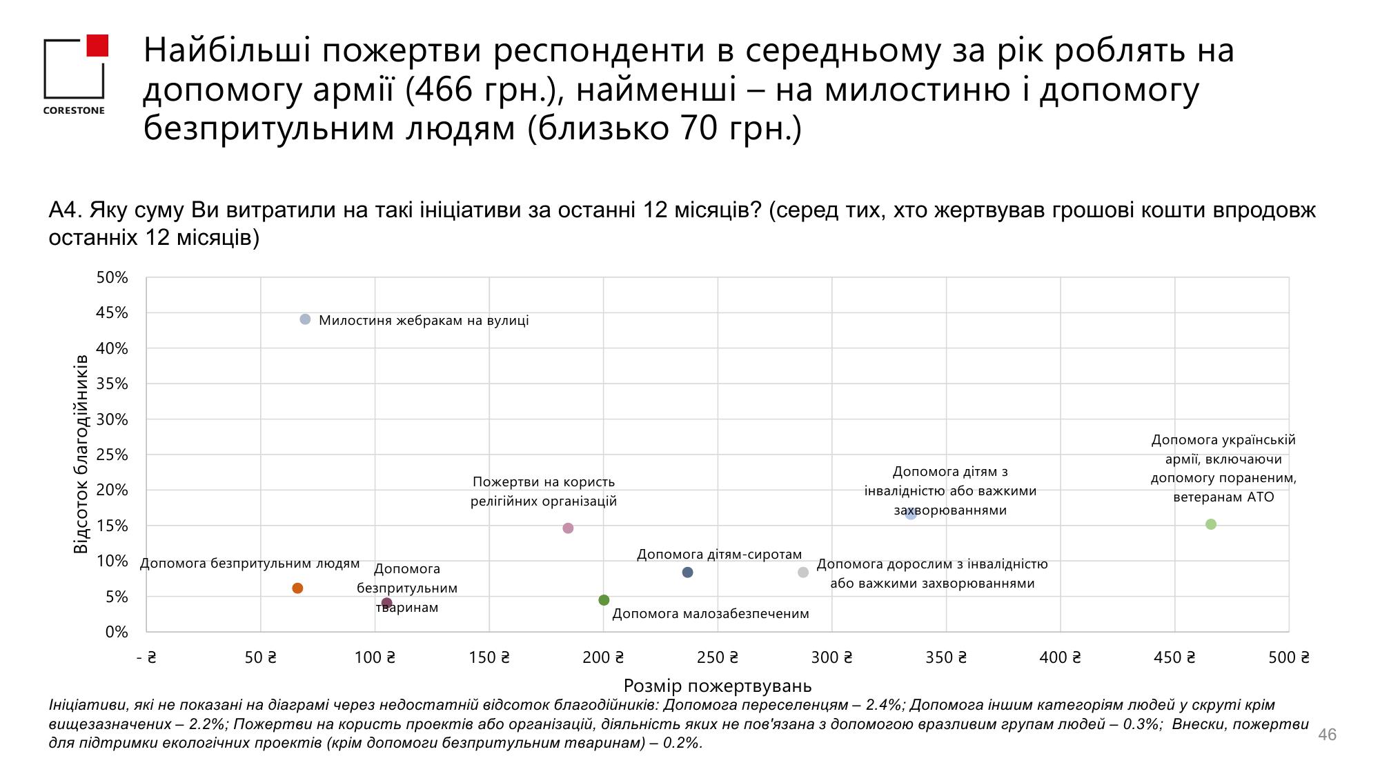 Окрім милостині жебракам та пожертв релігійним організаціям, які в середньому складали 69 та 184 грн. на рік відповідно, грошові пожертви найчастіше надавались на допомогу дітям з інвалідністю або важкими захворюваннями (17%, в середньому 334 грн. на рік) та на допомогу армії, включаючи допомогу пораненим та ветеранам (15%, в середньому 465 грн. на рік).