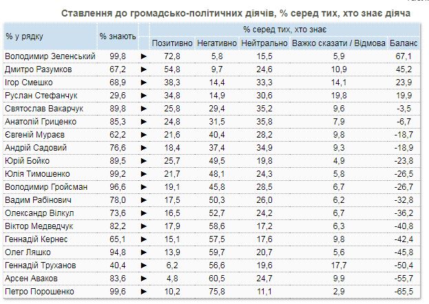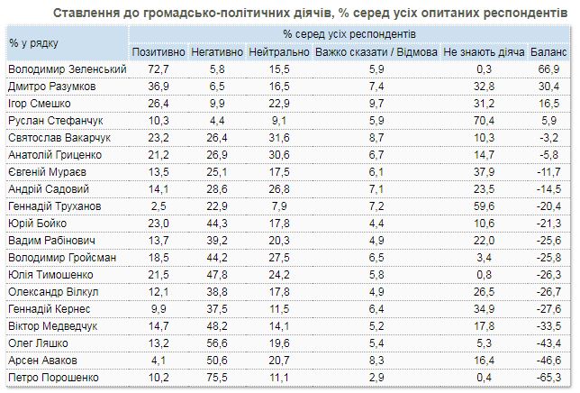 Що стосується позитивного сприйняття, то найбільше респондентів позитивно ставляться до президента Зеленського (72,8% з тих, хто знає його). Також користуються симпатіями лідер партії "Слуга народу" Дмитро Разумков (54,8%), Святослав Вакарчук (25,8%), Юрій Бойко (25,7%), Анатолій Гриценко (24,8%) та Юлія Тимошенко (21,7%). До п'ятого президента України Порошенко позитивно ставляться 10,2% опитаних.