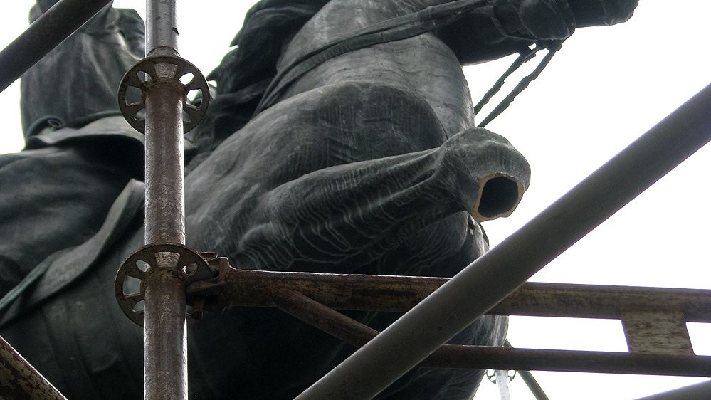 Бронзовий кінь київського пам'ятника Миколі Щорсу позбувся передньої ноги. Хто і коли її відпиляв, невідомо. Пам'ятник був захищений від демонтажу як об'єкт культурної спадщини. Монумент був включений до Державного реєстру нерухомих пам'яток України за категорією національного значення, як пам'ятник монументального мистецтва. Тим не менш, він неодноразово піддавався спробам руйнування або паплюження – у 2008 році його намагалися підірвати, в 2010 розмалювали фарбами. Після початку кампанії з декомунізації, активісти неодноразово вимагали, щоб київська влада демонтували монумент. Останнім часом пам'ятник був огороджений конструкцією з прапорів і готувався до демонтажу. Київська міська рада мала намір перенести пам'ятник Щорсу в Музей тоталітарної пропаганди СРСР.