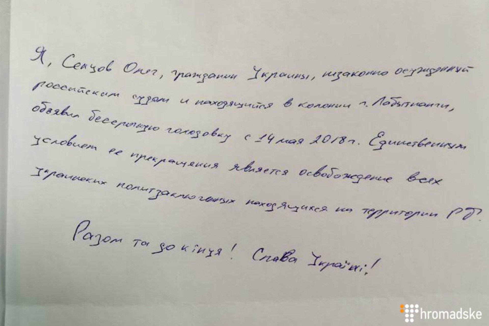 "Я, Сенцов Олег, громадянин України, незаконно засуджений російським судом і знаходиться в колонії м Лабитнангі, оголосив безстрокове голодування з 14 травня 2018 р Єдиною умовою її припинення є звільнення всіх українських політв'язнів знаходяться на території РФ. Разом та до кінця! Слава Україні", - написав Сенцов у заяві.